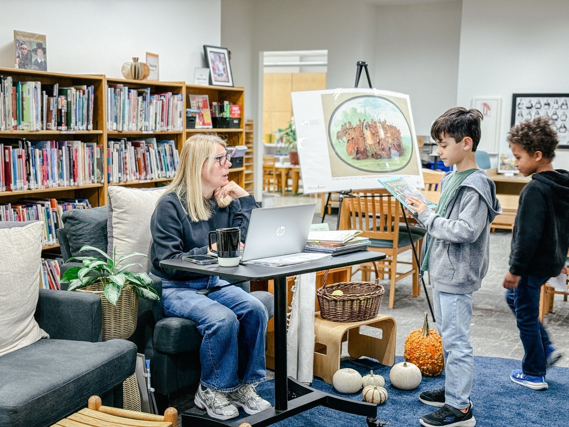 Situated in the heart of The Montessori School’s main building, the Library is a resource center that instills a love of reading and independent research skills among all members of the community. The Library’s collection contains more than 13,000 books, including a range of popular fiction, nonfiction, and reference works, as well as periodicals and electronic media that are varied and age-appropriate. Work done in the Library supports classroom curriculum, and students enjoy borrowing books for pleasure reading as well as research. The Library hosts a variety of events and opportunities yearly, including the Multicultural Fair, author visits, poetry events, and book fairs.